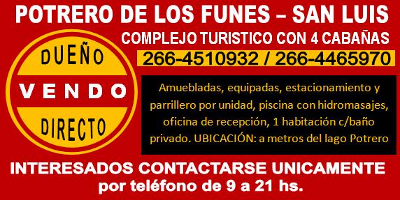 Due�o directo vendo complejo de 4 caba�as en Potrero de Los Funes a metros del Lago, San Luis, con, of, de recepcion, 1 hab. con ba�o privado, estacionamientos y parrilleros por caba�a, pileta con hidrosmasajes. Dolares 200000 sujeto a modificaciones. Informes unicamente a los telefonos 0266-4510932 y 0266-4465970, fotos en FANPAGE "VIVIENDAS HATIKVAH"